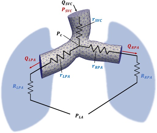The individual PVR can also be estimated using a CFD-based optimization algorithm that adjusts the LPA and RPA resistances to minimize the error between simulated and clinical flow and pressure data. This algorithm, implemented using the SimVascular (17) software package, produces separately identifiable distal resistances ( and ), as well as proximal resistances (, , and ) corresponding to the SVC, LPA, and RPA, respectively.