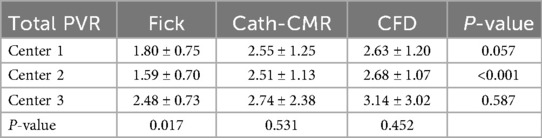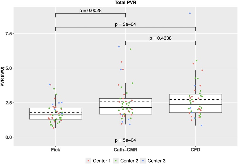 Figure 2. Comparison of total PVR between the three PVR estimation methods across all three centers indicates a significant difference between the Fick-based PVR and both the Cath-CMR and CFD-based PVR. In contrast, no statistical difference was found between the Cath-CMR-based PVR and CFD-based PVR.