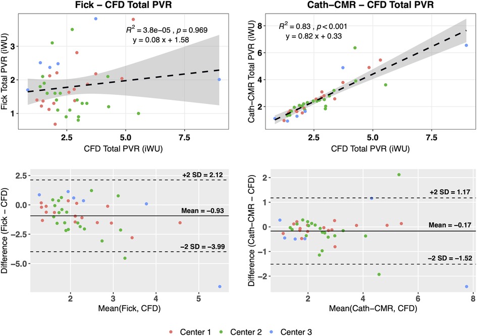 Figure 3. The Fick-based total PVR estimates show poor correlation with those of the CFD-based method, with the Fick-based method being different, on average, by −0.93 iWU. The Cath-CMR PVR, however, shows good correlation with the CFD-based PVR, with only a slight difference of −0.17 iWU.