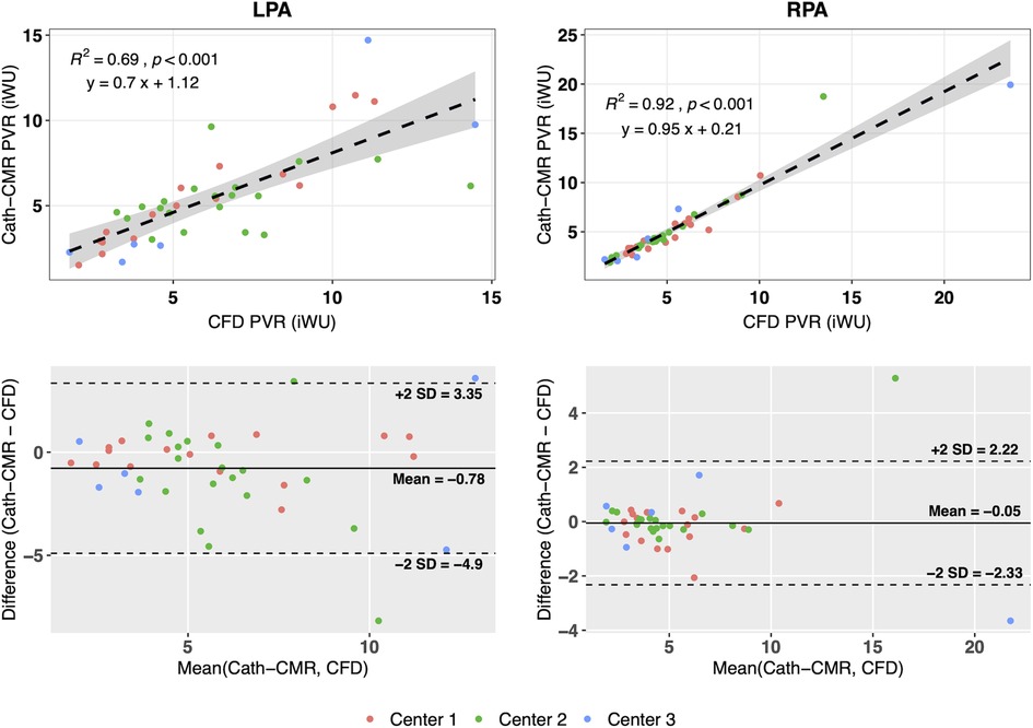 Figure 4. The individual lung resistances using the Cath-CMR method correlate well with those of the CFD method, particularly for the RPA. However, the Cath-CMR-based LPA PVR estimates show a bias of −0.78 iWU relative to the CFD-based LPA PVR, which is likely due to the increased proximal resistance in the LPA.