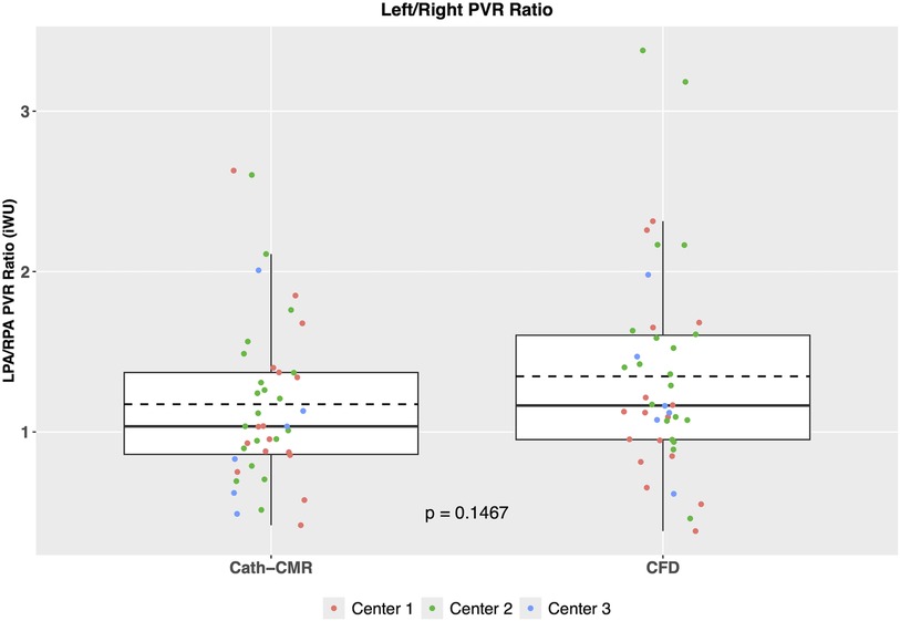 Figure 5. The ratio of LPA to RPA PVR reveals no significant difference between the Cath-CMR and CFD methods. Both methods demonstrate a slightly higher mean LPA resistance compared to RPA resistance.