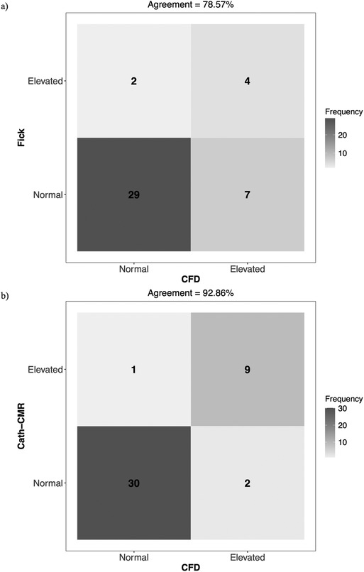 Figure 6. Confusion matrix of Fontan failure risk stratification agreement for (a) Fick vs. CFD and (b) Cath-CMR vs. CFD, using PHVD as an indicator. In this context, “Normal” refers to a transpulmonary pressure gradient ≤ 6 mmHg and an indexed PVR ≤ 3 iWU, while “Elevated” indicates values exceeding one of these two thresholds.