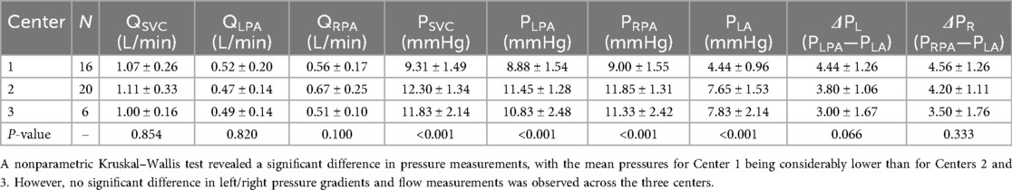 Comparison of clinically measured flow values across the three centers using the Kruskal–Wallis test revealed no statistically significant differences in flow within the SVC, LPA, or RPA (Table 1). In contrast, analysis of pressure measurements obtained via Cath showed significant differences among centers, with Center 1 exhibiting lower mean pressures in the SVC, LPA, RPA, and LA. However, despite these lower absolute pressures in Center 1, the mean pressure gradients in both the LPA () and RPA (), did not differ significantly between centers.