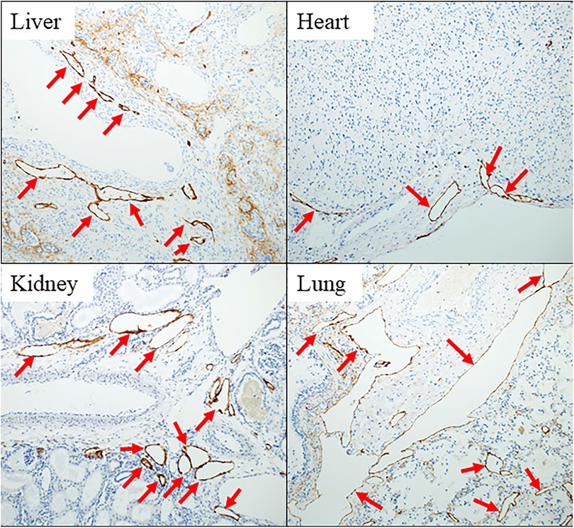 Figure 1. Pathological findings in case 2 in the late-DEAD group. Immunostaining for D2-40 of vital organs of the body stains the endothelium of lymphatic vessels brown. All red arrows indicate lymphatic ducts significantly dilated in each tissue.