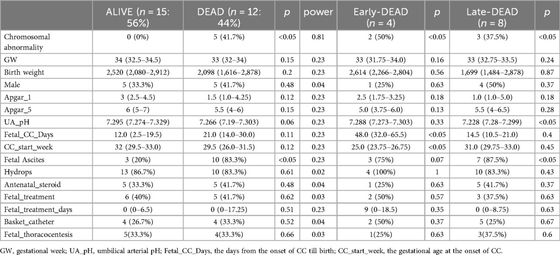 The rate of chromosomal abnormalities was significantly lower in the ALIVE group compared with both the Early-DEAD group (0% vs. 50%, respectively) and the Late-DEAD group (0% vs. 37.5%, respectively). Fetal_CC_Days was significantly shorter in the ALIVE group than in the Early-DEAD group (median 12 days vs. 48 days, respectively). In contrast, it was not significantly different between the ALIVE and the DEAD groups or between the ALIVE and the Late-DEAD groups. Moreover, the rate of fetal ascites was significantly lower in the ALIVE group than in the Late-DEAD group (20% vs. 87.5%, respectively).