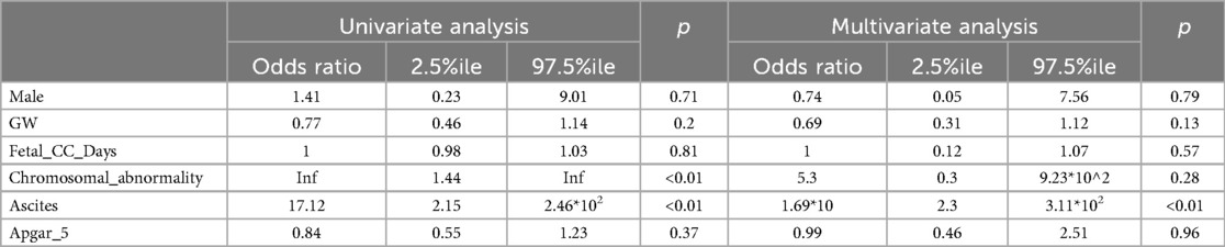 The results of the univariate and multivariate logistic regression analyses are shown in Table 2. In the univariate analysis, chromosomal abnormality and fetal ascites were significantly associated with mortality. In the multivariate analysis using Firth's regression, only fetal ascites remained a statistically significant independent predictor of death (OR 1.69*101, 95% CI 2.3–3.11*102, p < 0.01).