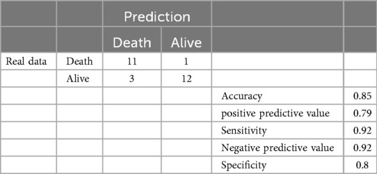 Although chromosomal abnormality was not an independent predictor in the multivariate model, it was a strong predictor in the univariate analysis and is a clinically critical condition. Therefore, we constructed a predictive model for mortality using both chromosomal abnormality and fetal ascites. The performance of this model is detailed in the confusion matrix in Table 3. The model demonstrated a high prediction accuracy of 0.85, with a positive predictive value of 0.79, a sensitivity of 0.92, a negative predictive value of 0.92, and a specificity of 0.80.
