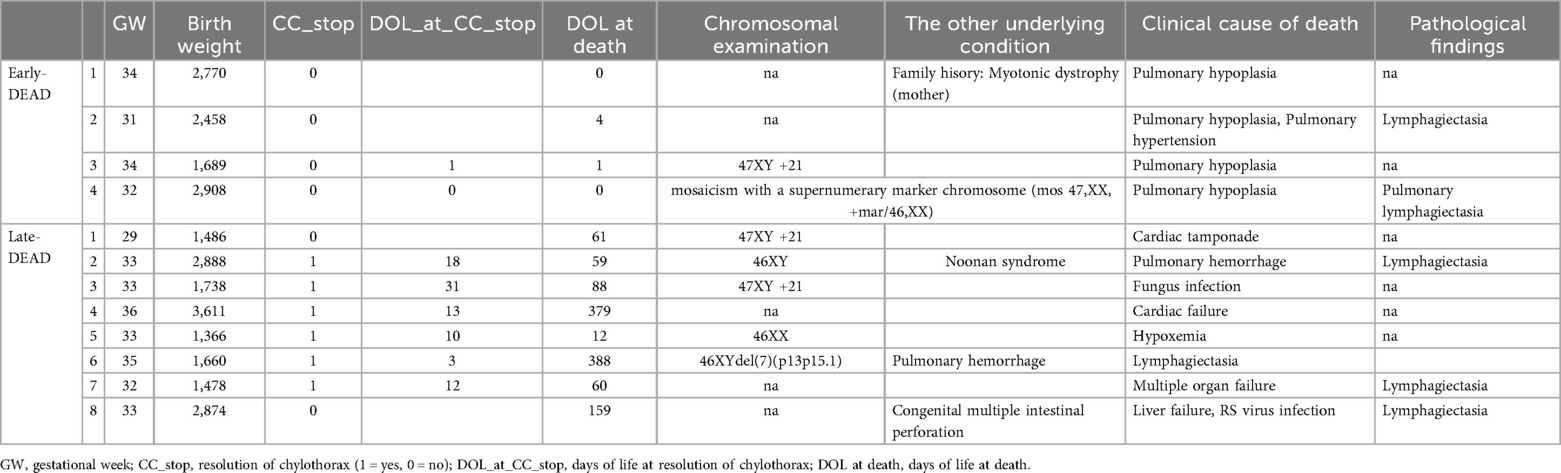 For all the Early-DEAD patients, the clinical cause of death was diagnosed as lung hypoplasia. In contrast, the causes of death among the eight Late-DEAD patients were more varied, including pulmonary hemorrhage (n = 2), cardiac failure or tamponade (n = 2), infection (n = 2), multiple organ failure (n = 1), and hypoxemia (n = 1) (Table 4). In six of these eight Late-DEAD patients, chylothorax had resolved before death.