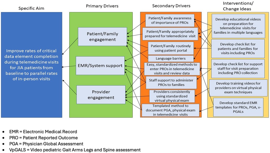 Based on the needs assessment and site survey, a Key Driver Diagram was created as a framework for developing and adopting proposed interventions to improve collection of CDE. (Figure 1: KDD). Site survey participants free test responses to the question, “What do you see as your sites biggest barriers to improving standard collection of patient reported outcomes in telemed visits and virtual physical exams” were analyzed qualitatively using an inductive thematic approach. One author (KH) coded the responses and the themes were reviewed and approved by co authors (MBT, EM, GY) Three themes emerged: inadequate preparation of patients, incomplete or inconsistent systems processes and inadequate provider engagement with telemedicine as a modality. These thematic groupings were used to generate three primary drivers for improvement in the KDD: patient and family engagement, electronic medical record (EMR) and system support, and provider engagement. Corresponding interventions were developed to support patients, staff and clinicians in navigating telemedicine visits. The intervention materials were assembled as part of a broader change package in order to promote the implementation of best practices for optimizing telemedicine care for families with JIA. The change package includes an instructional guide, suggested interventions, and quality improvement tools to facilitate and monitor progress.