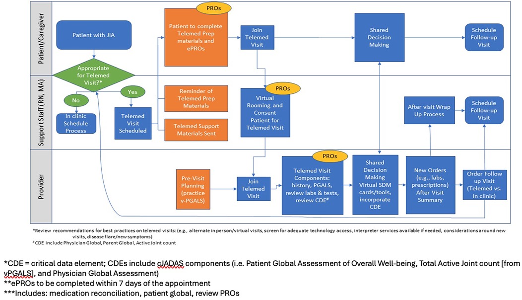 PR-COIN has identified a core group of data elements to be collected at every patient visit to track JIA disease outcomes in part to facilitate a T2T strategy to improve rates of inactive disease, and in part to enable tracking of a broader set of quality measures (18). These Critical Data Elements (CDE) include components required to calculate the clinical Juvenile Arthritis Disease activity score (cJADAS), (i.e., complete joint count, physician global assessment of disease activity, patient assessment of overall well-being) as well as components of the American College of Rheumatology provisional criteria for inactive disease, and Patient Related Outcomes (PROs) such as arthritis related pain (19–21). While these CDEs are items that can, in theory, be gathered during telemedicine encounters, data on the quality of pediatric rheumatology virtual visits early in the pandemic showed that collection rates for CDE in virtual visits were significantly lower than for in-person care (22, 23).