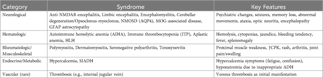 Another potential factor is immunogenetic predisposition, particularly in patients with a family history of autoimmune diseases such as systemic lupus erythematosus (SLE). These theories highlight the complex interplay between neoplastic and autoimmune processes and may explain why tumor resection often leads to resolution of hemolysis in reported cases. While our patient only presented with autoimmune hemolytic anemia (AIHA), it is important to note that ovarian teratomas have been associated with a broader spectrum of paraneoplastic syndromes described in the literature (16) (Table 1). Neurological syndromes include anti–N-methyl-D-aspartate receptor (NMDAR) encephalitis, limbic encephalitis, encephalomyelitis, neuromyelitis optica spectrum disorder [NMOSD; associated with aquaporin-4 (AQP4) antibodies], myelin oligodendrocyte glycoprotein (MOG)-associated disease, glial fibrillary acidic protein (GFAP) astrocytopathy, progressive cerebellar degeneration, and opsoclonus–myoclonus syndrome (OMS) (17). Non-neurological manifestations, though rare, have also been described, including immune thrombocytopenia (ITP), aplastic anemia, hemophagocytic lymphohistiocytosis (HLH), polymyositis, dermatomyositis, seronegative polyarthritis, and tenosynovitis (16, 18–20). Endocrine and metabolic disturbances such as paraneoplastic hypercalcemia and syndrome of inappropriate antidiuretic hormone secretion (SIADH), as well as vascular events like paraneoplastic venous thrombosis, have also been reported (19, 21).