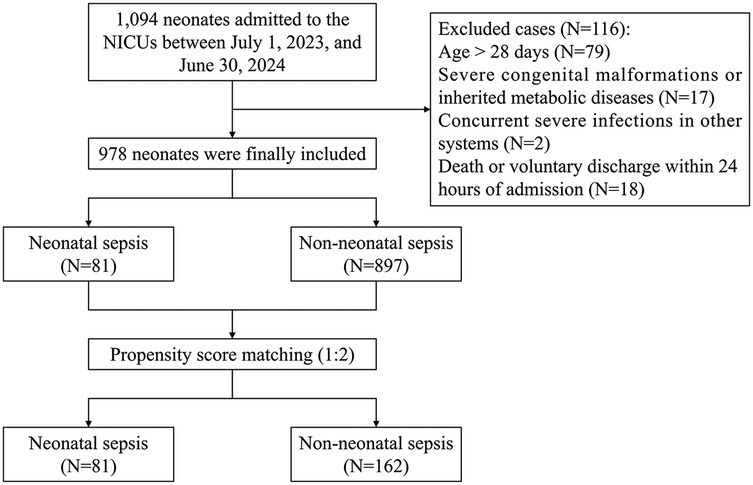 A total of 1,094 neonates were admitted to the NICUs of the two hospitals between July 1, 2023, and June 30, 2024. After excluding 116 neonates who did not meet the inclusion criteria, 978 neonates were finally included. Throughout the study period, only three in-hospital deaths (0.3%) were recorded. However, a notably high rate of discharge against medical advice was observed, accounting for 4.6% (45/978) of the cohort. Before matching, the cohort comprised 81 neonates in the NS group and 897 in the non-NS group. Following 1:2 PSM, there were 81 in the NS group and 162 in the non-NS group. Figure 1 presents a flow chart of patient selection and study design.
