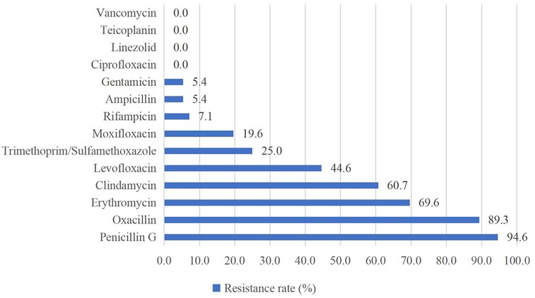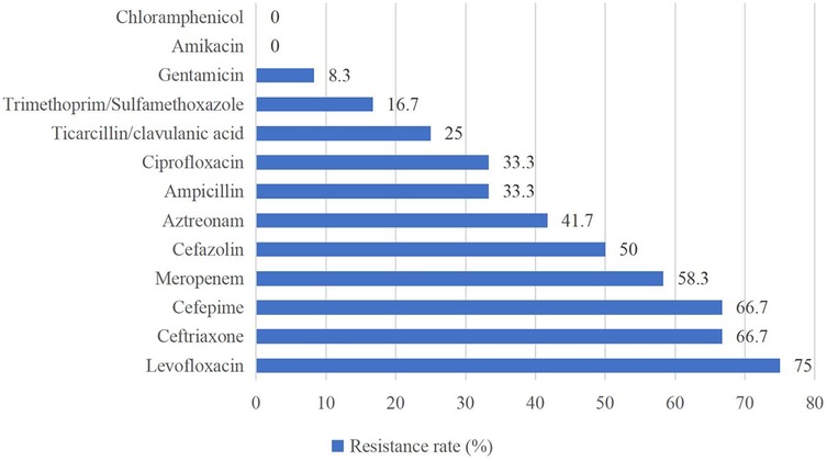 Of the Gram-positive bacteria detected, almost all strains were resistant to penicillin G (94.6%) and oxacillin (89.3%). None of the strains were resistant to vancomycin, teicoplanin, linezolid, or ciprofloxacin (Figure 2). For Gram-negative bacteria, high resistance rates (above 50%) were observed for levofloxacin (75.0%), ceftriaxone (66.7%), cefepime (66.7%), and meropenem (58.3%). Gram-negative bacteria showed the highest susceptibility to chloramphenicol and amikacin (Figure 3).