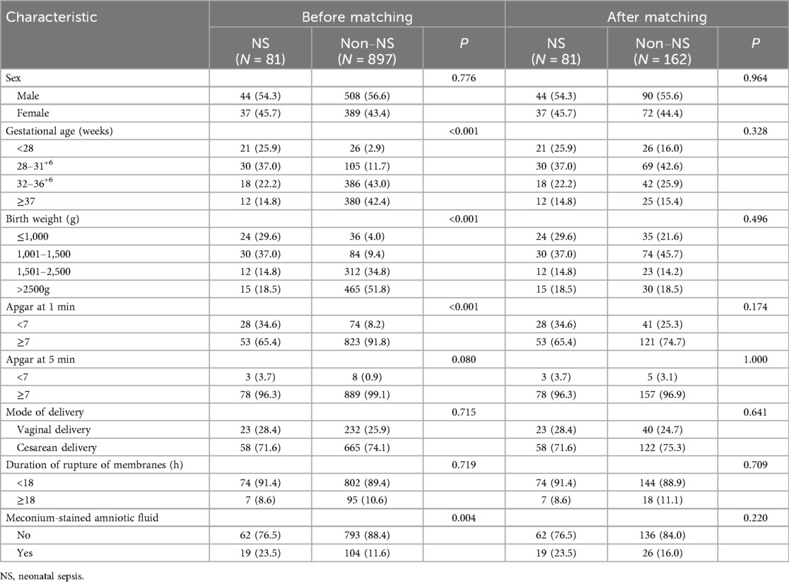 The baseline characteristics of the study participants are summarized in Table 2. Among all included neonates, males were more common, and most deliveries were by cesarean section. Before matching, the NS group and the non-NS group differed significantly in several baseline clinical characteristics. The NS group had a higher proportion of extremely preterm infants (<28 weeks: 25.9% vs. 2.9%) and extremely low birth weight infants (≤1,000 g: 29.6% vs. 4.0%), lower Apgar scores at 1 min (<7: 34.6% vs. 8.2%), and higher rates of meconium-stained amniotic fluid (23.5% vs. 11.6%) (all P < 0.05). After 1:2 PSM, all variables were balanced between the case and control groups with no significant differences (all P > 0.05).