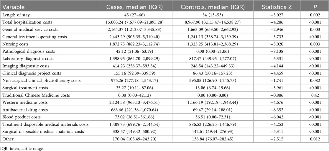 After PSM, the median LOS in the case group was 45 days, significantly longer than the 34 days in the control group (P = 0.002), with a median difference of 11 days. The median total hospitalization costs were $15,003.24 and $8,967.90 for the case and control groups, respectively, with a difference of $6,035.34 (P < 0.001). Comparison of hospitalization costs between groups showed statistically significant differences in all categories except for non-surgical clinical physiotherapy costs and TCM costs, as detailed in Table 3.