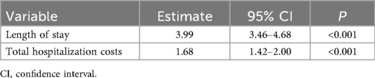 In the negative binomial regression model, the LOS attributable to NS was 3.99 times (95% CI: 3.46–4.68, P < 0.001) higher than that in non-NS infants. Gamma regression analysis showed that total hospitalization costs attributable to NS were 1.68 times (95% CI: 1.42–2.00, P < 0.001) higher than those in non-NS infants, as shown in Table 4.