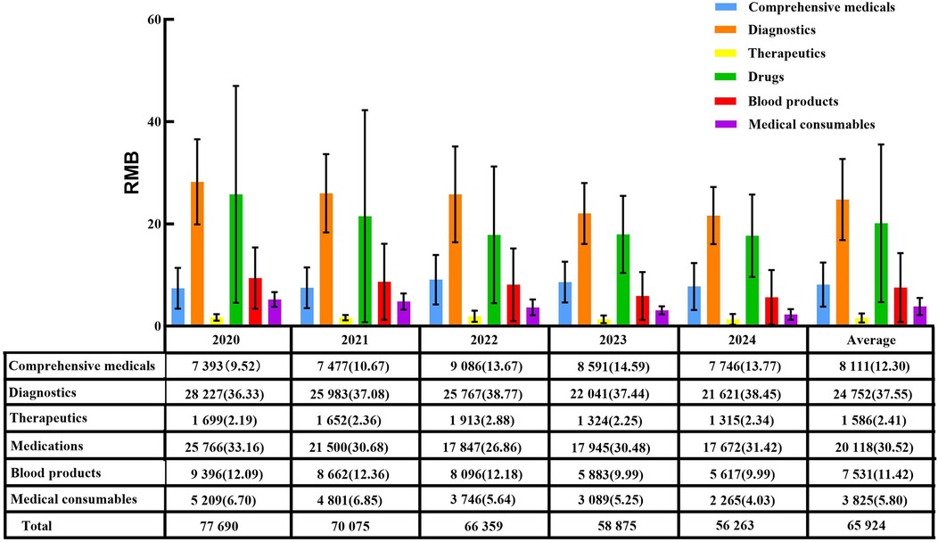 Figure 1. Average hospitalization costs and their proportions during the induction phase in patients with ALL from 2020 to 2024 [RMB(%)].