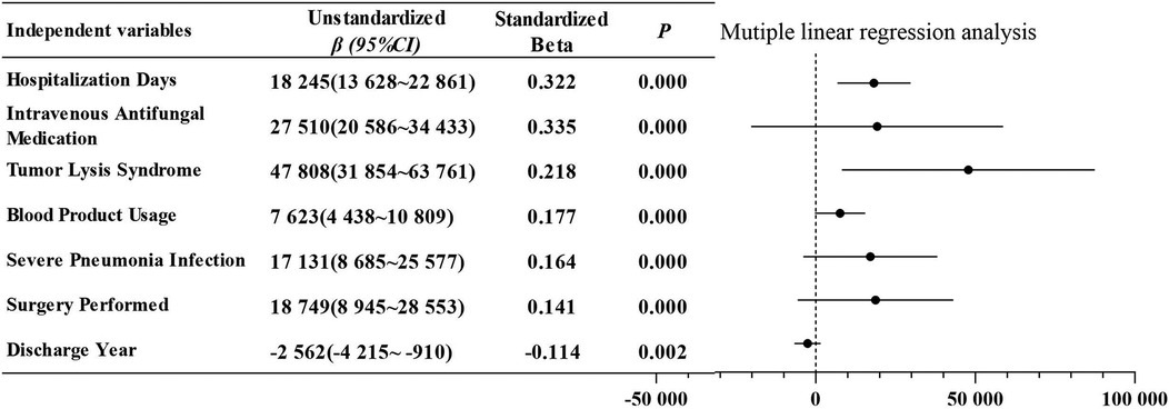 Univariate analysis indicated that hospitalization costs during the induction phase were influenced by several factors, including hospitalization days, discharge year, payment method, surgery performed, blood product usage intravenous antifungal medication, special-grade antibioticsusage, severe pneumonia infection, admission to the intensive care unit, tumor lysis syndrome, pancreatitis, and hepatic dysfunction (Table 5). In the subsequent multivariate analysis, which included independent variables identified as significantly different from the univariate analysis, hospitalization days, intravenous antifungal medication, tumor lysis syndrome, blood product usage, severe pneumonia infection, surgery performed and discharge yearwere determined to be independent predictors of increased costs (Figure 2). This model yielded an adjusted r2 of 0.619 (F = 68.5, P < 0.001). The Durbin–Watson statistic was 2.251, indicating independence of residuals, and the variance inflation factors ranged from 1.040–1.403, suggesting no multicollinearity among variables.