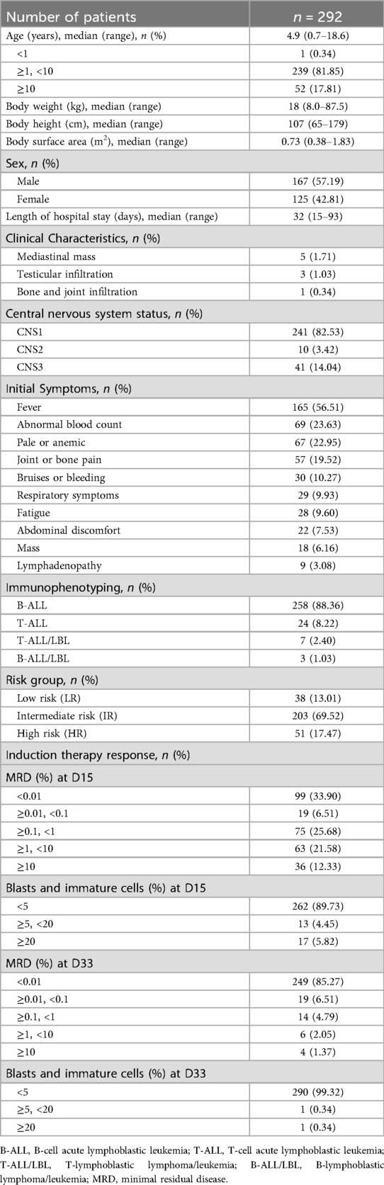 A total of 292 children with newly diagnosed ALL were included in this study. The median age was 4.9 years (range: 0.7–18.6 years), with a male-to-female ratio of approximately 6:4. Most patients had B-cell ALL (88.36%, n = 258), and 69.52% (n = 203) were classified as intermediate-risk. The most common symptoms at admission were fever (56.51%, n = 165) and abnormal blood counts (23.63%, n = 69). CNS1 was observed in 82.53% (n = 241) of cases. By day 33 of induction therapy, 85.27% (n = 249) of patients had minimal residual disease <0.01%, and 99.32% (n = 290) achieved good bone marrow remission (Table 1).