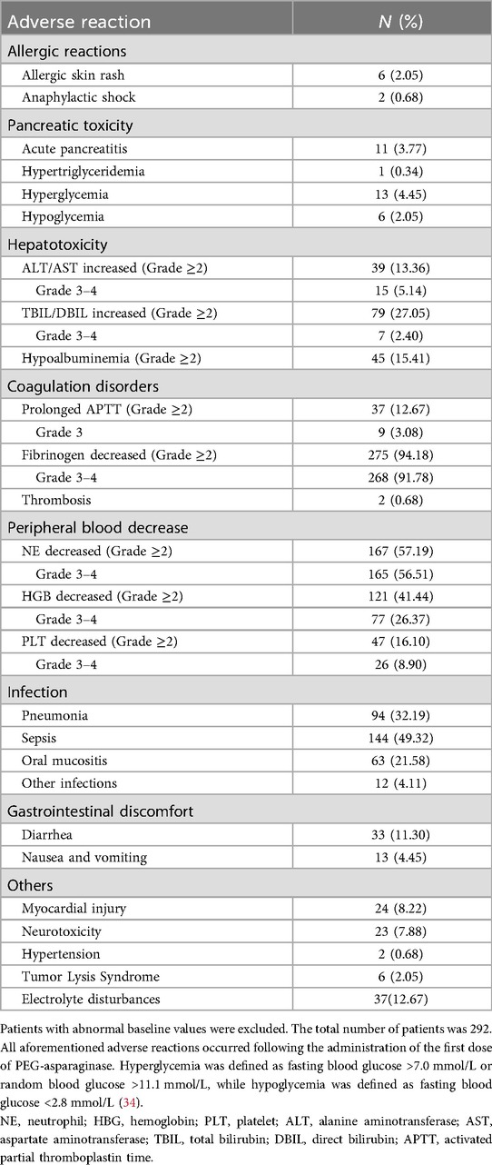 This study found that the incidence and severity of adverse reactions associated with PEG-asparaginase should be closely monitored during the induction phase of treatment. Coagulation disorders were particularly prominent, with 91.78% of patients experiencing grade 3 or higher fibrinogen reduction. This finding is consistent with PEG-asparaginase inhibiting hepatic protein synthesis, leading to reduced coagulation factor production (18). Although only two cases of thrombosis occurred in this study, the findings highlight a dual risk of “bleeding-thrombosis” during ALL treatment, necessitating dynamic monitoring of coagulation indicators. Additionally, the incidence of acute pancreatitis was 3.77%. Early clinical manifestations included gastrointestinal symptoms such as nausea, vomiting, and abdominal pain, accompanied by elevated serum amylase. In this study, only one case of anaphylactic shock was associated with PEG-asparaginase, which improved after symptomatic treatment. This may be attributed to the low immunogenicity of pegaspargase, resulting in a low incidence of allergic reactions (19). Abnormal blood glucose levels were observed in 19 patients, which were strongly associated with the use of glucocorticoids in the chemotherapy regimen, although the effects of PEG-asparaginase on insulin secretion and carbohydrate metabolism could not be ruled out (20). These patients generally did not require hypoglycemic therapy, as their blood glucose levels gradually normalized after chemotherapy.