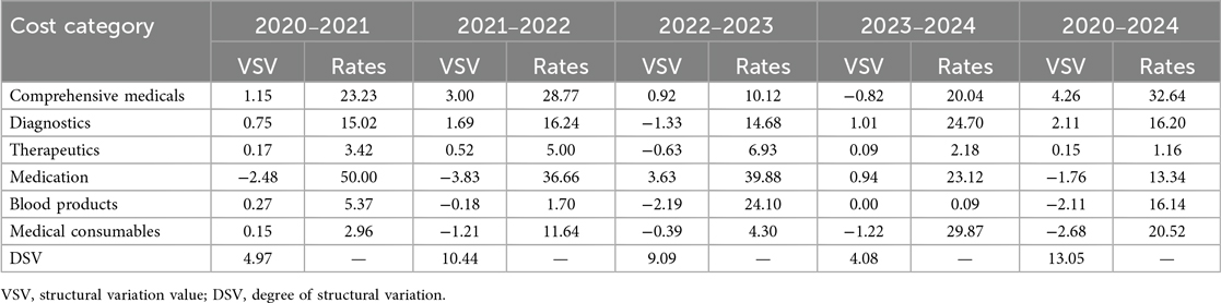 Normally distributed data are expressed as mean ± SD, while non-normally distributed data are expressed as median (P25, P75). Cost-related factors were examined using Mann–Whitney U or Kruskal–Wallis tests, and significant variables were entered into multivariate analysis with total costs as the dependent variable. Cost structure was assessed using the structural variation value (VSV), degree of structural variation (DSV), and contribution rate (17). Grey correlation analysis was applied to assess associations between cost components and total expenses (17). Statistical significance was set at P < 0.05. Data were analyzed using Excel 2019, SPSS 26.0, and GraphPad Prism 10.1.2. Excel 2019 was used to collate baseline patient data, calculate the incidence of adverse reactions, compute structural variation indicators of hospitalization costs, and perform grey relational analysis to identify cost-related associations. SPSS 26.0 was used to determine the distribution of continuous variables, conduct univariate analysis of cost-influencing factors, and construct a multivariate linear regression model to identify independent predictors of hospitalization costs. GraphPad Prism 10.1.2 was used to create charts to display the trends and compositions of annual average hospitalization costs and to visualize the key factors driving higher costs identified by regression analysis.