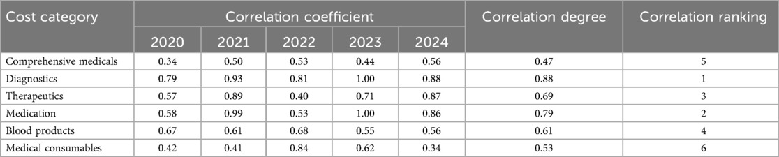 From 2020–2024, per capita hospitalization costs for patients with ALL during the induction phase continuously decreased from 77,690 RMB to 56,263 RMB, with an overall mean of 65,924 RMB. Diagnostic fees (37.55%) and medication (30.52%) constituted the largest proportions of total costs (Figure 1). The main contributors to structural change were, in descending order, comprehensive medical services (32.64%), consumables (20.52%), diagnostic fees (16.20%), and blood products (16.14%) (Table 3). Grey relational analysis showed that diagnostic fees had the highest correlation with total costs (0.88), followed by drugs (0.79) (Table 4).