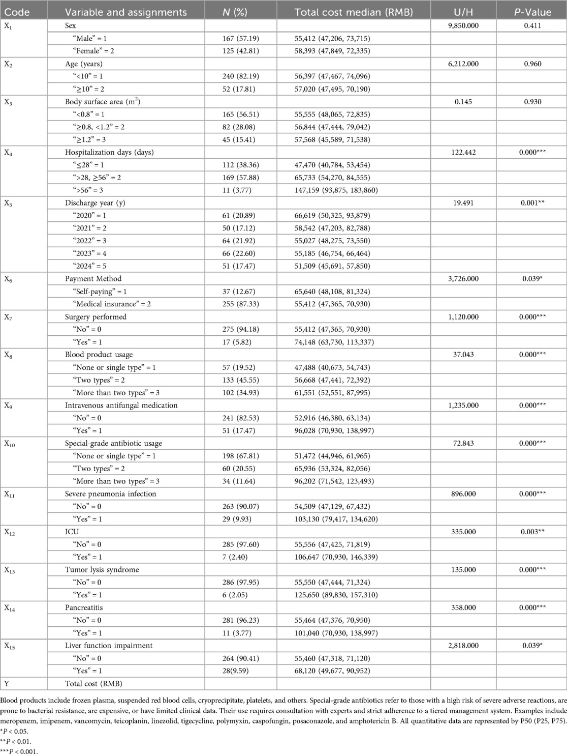 Table 5. Univariate analysis of total hospitalization costs and variable assignments during the induction phase in patients with ALL.