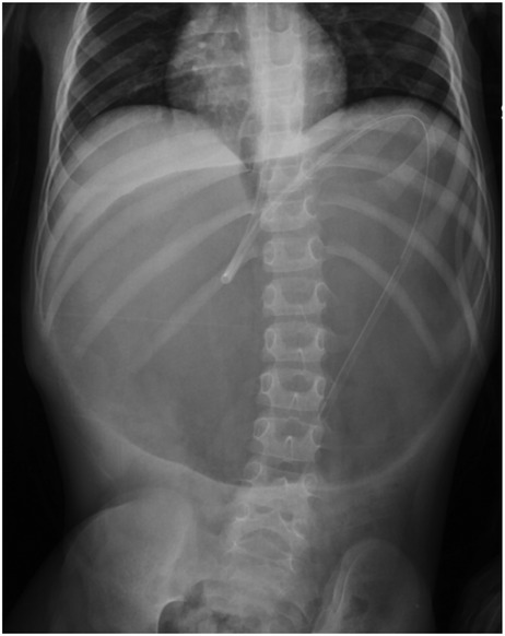 After intravenous resuscitation, a nasogastric tube was inserted, initially draining approximately 100–200 cc of gastric material, after which a second plain abdominal x-ray was performed and confirmed persistent gastric distension.