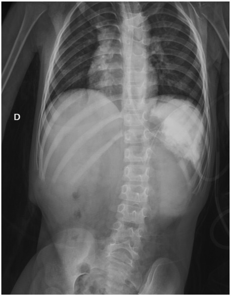 A barium study (Figure 2) demonstrated a partial rotation of the greater curvature toward the diaphragmatic side, raising suspicion of gastric volvulus, also supported by delayed gastric emptying. After intravenous resuscitation, the nasogastric tube was inserted, draining approximately 1,200 cc of gastric content with no evidence of bilious fluid. A repeat plain abdominal x-ray was performed, confirming the persistence of the volvulus.