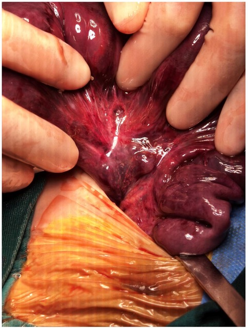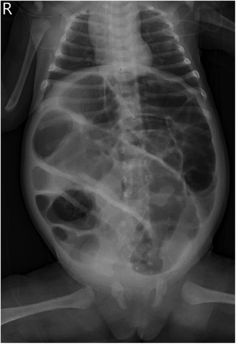 Volvulus is usually a severe and rapidly progressive condition with high destructive potential. Volvulus can be categorized into total midgut volvulus and segmental volvulus (SV) based on the length of the intestinal segment involved. For neonates, the most common clinical type is congenital intestinal malrotation with midgut volvulus; however, SV is relatively rare (2). A small subset of cases present as isolated SV without anatomical or pathological abnormalities, which is referred to as PSV (1, 3, 4). A previous study has shown that PSV usually occurs in preterm infants, particularly at two specific time points, with a median age of 3 days for early-onset volvulus and 45 days for late-onset volvulus. However, the corrected gestational ages of these patients are similar, suggesting that PSV can occur at specific gestational ages of neonates, which is consistent with the age of onset observed in the present case (5). Currently, the etiology of PSV remains unclear. On the one hand, the unique physiological structure of neonates leads to impaired peristalsis, which delays or even obstructs the emptying of intestinal contents (6). Moreover, the presence of immature ganglion cells in the intestinal tract also exacerbates this condition (7). On the other hand, the special anatomical structure of preterm infants, including the congenital mesenteric elongation or constriction of the small intestine, can increase the risk of developing PSV (8). In addition, non-invasive ventilation (NIV), especially nasal high-frequency oscillation (nHFO), has been suggested to promote intestinal dilation, potentially increasing the risk of PSV (9). Neonates typically present with the clinical manifestations of low small intestinal obstruction, including abdominal distension, bilious vomiting, and feeding intolerance. Notably, in infants presenting with acute abdomen, severe anemia, particularly in a 3-month-old, should be recognized as a critical warning sign, as it may indicate ongoing intestinal ischemia or necrosis. PSV is essentially a form of strangulated bowel obstruction, and, therefore, patients may also exhibit bloody stools, abdominal tenderness, ascites, and hypotension. As the condition progresses, metabolic acidosis, sepsis, shock, DIC, and even death can occur (10). An upper gastrointestinal (UGI) contrast study is generally the first-line imaging test for ruling out intestinal malrotation (11). However, in this infant, given the presence of severe abdominal distention and peritonitis with a risk of intestinal necrosis, UGI was avoided, as the hypertonic contrast agent might exacerbate bowel necrosis. Abdominal ultrasound findings may reveal nonspecific findings such as bowel dilation, bowel wall thickening, and ascites, whereas the “whirlpool sign” is rarely observed (12). It should be noted that abdominal ultrasonography, which is inherently operator-dependent, was performed by the attending radiologists in the Department of Ultrasonography or by our neonatologist in our neonatal intensive care unit (NICU). All of these clinicians have extensive experience in clinical and critical care ultrasound. An abdominal x-ray may exhibit features consistent with low intestinal obstruction. The presence of a fixed bowel loop, without signs of intestinal atresia—such as significant bowel dilatation, gasless abdomen, and “double-bubble sign” on multiple abdominal x-rays—may suggest PSV. Nevertheless, this imaging finding is non-specific and must be interpreted in clinical context. Furthermore, diagnostic paracentesis may yield bloody ascites, indicating bowel necrosis and further supporting the suspicion of PSV. In this case, rapid diagnostic paracentesis was performed to evaluate the characteristics of the ascitic fluid, assess for pneumoperitoneum, obtain a valuable sample for pathogen detection, and transiently relieve intra-abdominal pressure. The infant had an uneventful feeding history prior to presentation, without signs of feeding intolerance, and presented with an abrupt onset of symptoms. Based on the clinical manifestations and imaging findings, PSV was suspected preoperatively and subsequently confirmed during surgery.