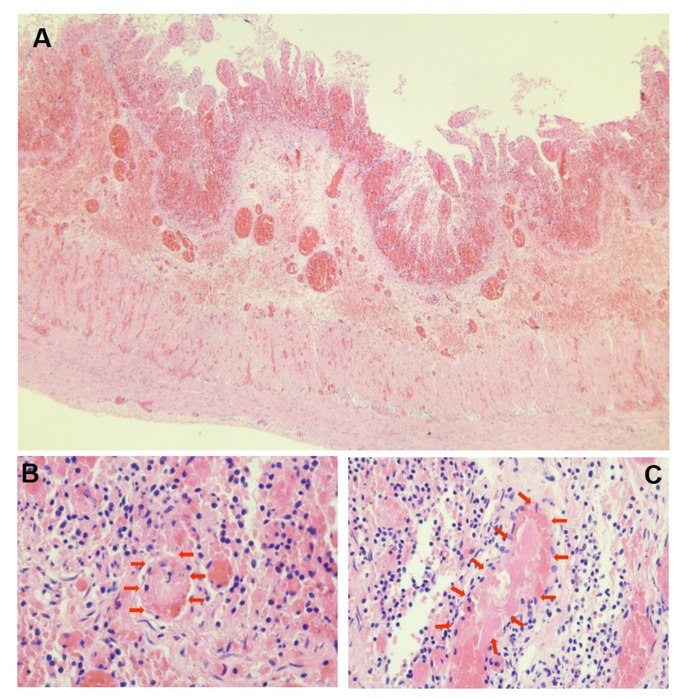 Figure 3. Hematoxylin and eosin–stained sections of necrotic intestine. (A) × 40: preserved wall structure with congestion, hemorrhage, and mucosal necrosis. (B,C) × 400: red arrows indicating intravascular throm.