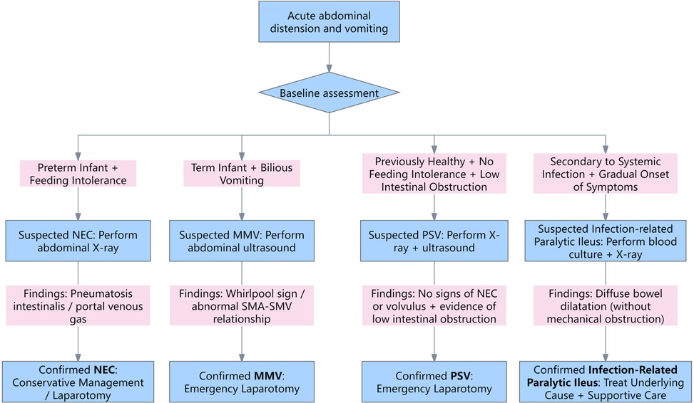 Before proceeding to surgery, it was essential to consider other potential causes of acute neonatal abdominal distension. NEC is the most common surgical emergency in premature infants, typically presenting in the second to third week of life with feeding intolerance, bilious vomiting, abdominal distension, and blood in stool (13). Abdominal x-ray may show pneumatosis intestinalis, portal venous gas, or pneumoperitoneum (14). Intestinal malrotation with midgut volvulus also presents acutely with bilious vomiting and abdominal distension, but is characterized by specific ultrasonographic signs, such as the “whirlpool sign” and abnormal orientation of the superior mesenteric artery and vein (15). Infection-related paralytic ileus is a functional obstruction secondary to systemic infections such as sepsis, typically presenting with diffuse bowel dilatation without evidence of mechanical obstruction, and a more gradual onset of symptoms (16). In contrast, PSV typically occurs in previously healthy neonates, presenting with bilious vomiting and abdominal distension without feeding intolerance. It can be differentiated from NEC, midgut volvulus, and paralytic ileus by manifesting as a low intestinal obstruction and lacking the characteristic radiologic or ultrasonographic features associated with these conditions. The differential diagnosis flowchart is shown in Figure 4.