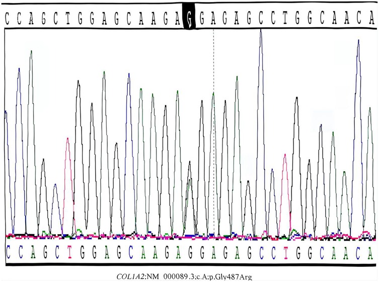 Figure 2. Sanger sequencing confirmation of the COL1A2 mutation in the proband. Postnatal Sanger sequencing validation confirmed the presence of the heterozygous c.1459G > A mutation (red arrow) in the proband's peripheral blood DNA. This missense mutation leads to the substitution of glycine by arginine at position 487 (p.Gly487Arg) within the highly conserved triple-helical domain of the collagen α2(I) chain. Such structural mutations are typically associated with a severe type III OI phenotype.