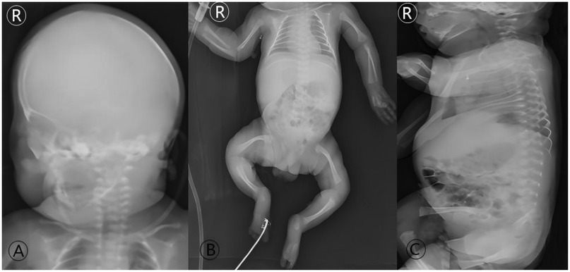 Figure 3. Initial radiographic skeletal survey at admission (Day 9 of life). Full-body radiographs demonstrate the classic imaging features of severe, type III OI: (A) diffuse osteopenia and thinning of the cranial vault. (B) Generalized osteopenia of the long bones, thin cortices, relatively widened medullary cavities, and flared metaphyses; slender and curved bilateral clavicles are also evident. (C) Loss of normal spinal curvatures. These findings form the radiographic basis for the diagnosis of OI in the neonatal period and explain the inherent high fracture risk.
