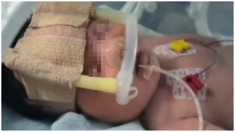 Examination in the NICU revealed a neonate exhibiting tachypnea (56 breaths per minute), significant tracheal retractions, thoracoabdominal asynchrony, coarse breath sounds with rales bilaterally, and oxygen saturation declining to 85%, necessitating nasal Continuous Positive Airway Pressure (nCPAP) (Figure 4). Notably, bilateral knee valgus deformities and bowing of the lower limbs were observed, consistent with the prenatal diagnosis. The sclerae were not blue.