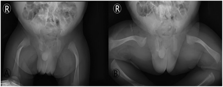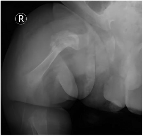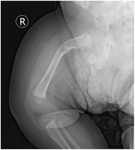 On the 16th day after discharge (25th day of life), the infant experienced a spontaneous fracture of the right proximal femur (Figure 5). The family promptly consulted our pediatric orthopedic team.