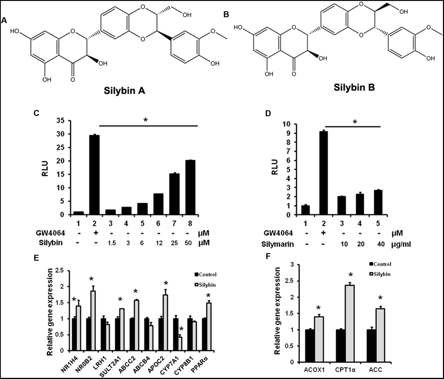 Farnesyl X receptor agonists have been shown to activate a series of target genes. We therefore examined whether silybin could regulate known target gene expression in HepG2 cells. As expected, silybin treatment induced FXR target gene expression when compared with mock control groups (Figures 1E,F), suggesting an increased FXR transactivity by silybin.