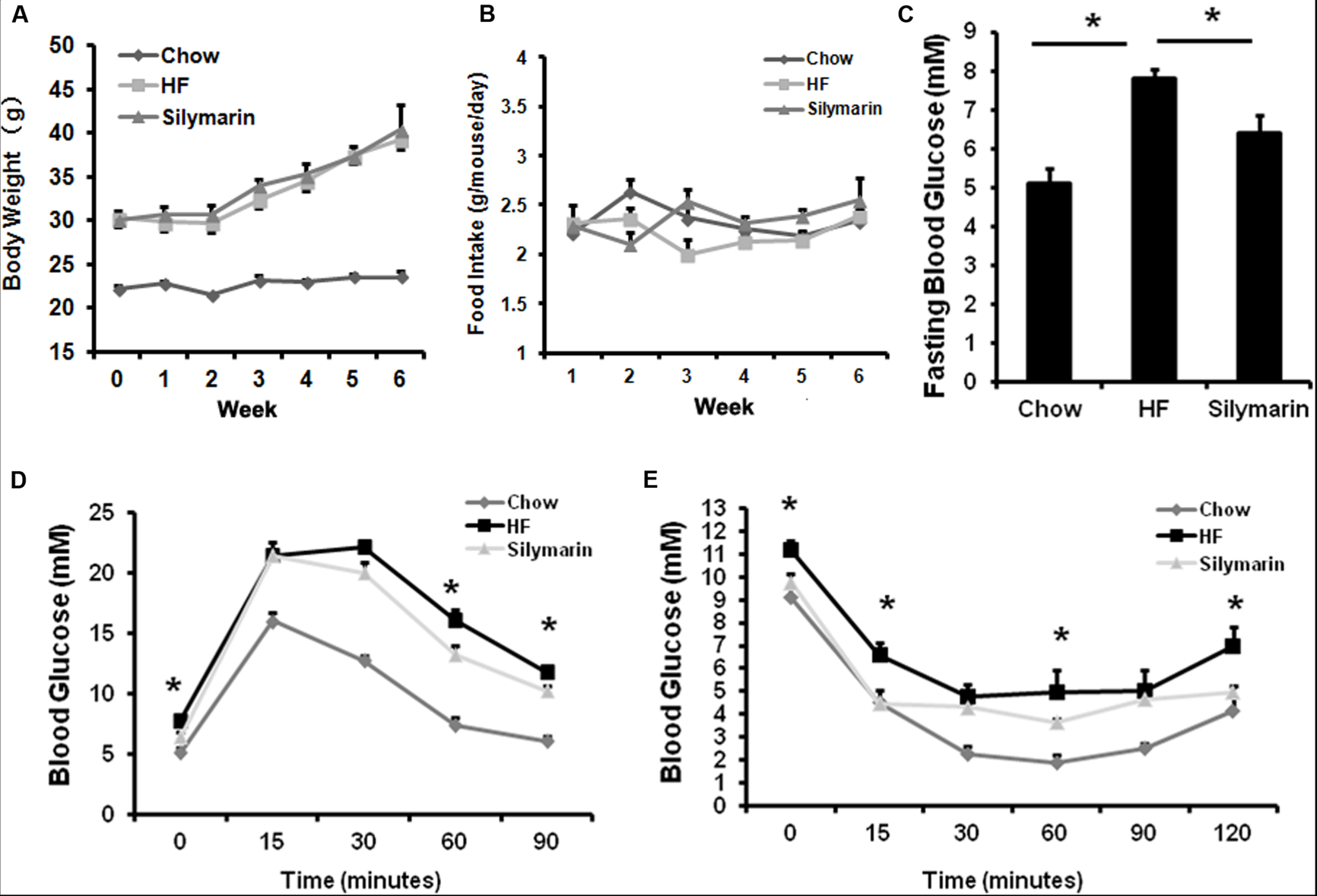 Silymarin improves blood glucose homeostasis in DIO C57BL/6 mice. (A) Body weight during the 6-week treatment. (B) Food intake amount. (C) Fasting blood glucose level. (D) Glucose tolerance test (GTT). The mice were fasted overnight, and glucose were intraperitoneally injected (1 g of/kg body weight) and blood glucose levels were determined at the indicated time points. (E) Insulin tolerance test (ITT). The non-fasted mice were intraperitoneally injected with insulin (0.75 U/kg body weight) and blood glucose levels were determined. Data are presented as means ± SEM (n = 7). ∗P < 0.05, vs. Chow or HF group, NS, No significance.