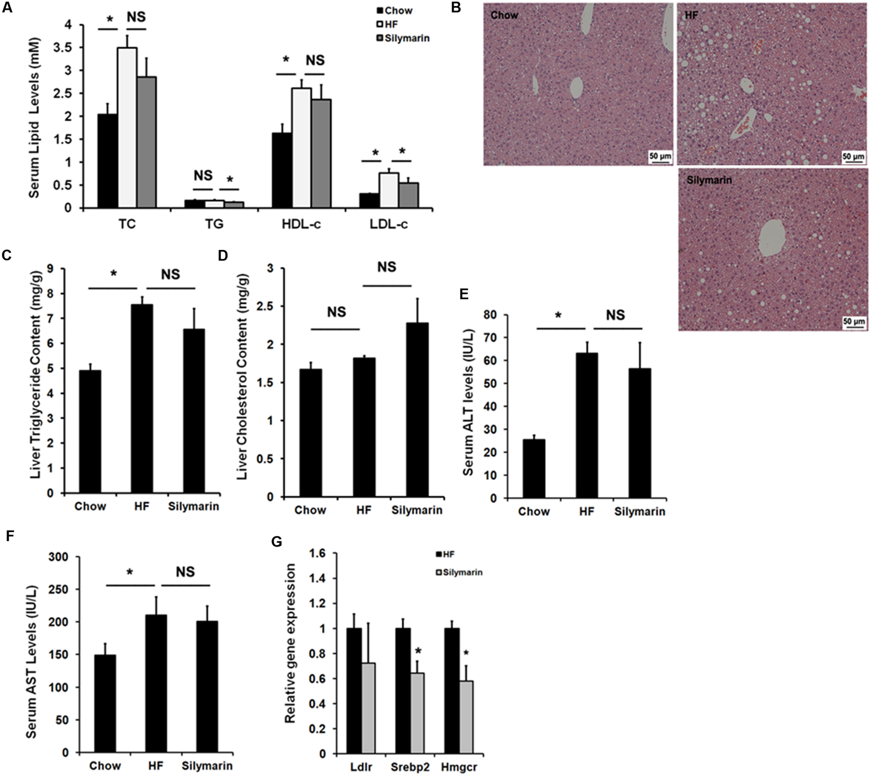 Experimental approach: C57BL/6 mice were fed high-fat diet (HFD) for 3 months to induce obesity, insulin resistance, hyperlipidaemia, and fatty liver. These mice were then continuously treated with HFD alone or mixed with silymarin at 40 mg/100 g for additional 6 weeks. Biochemical analysis was used to test the serum lipid and bile acid profiles. Farnesyl X receptor (FXR) and nuclear factor kappa B (NF-κB) transactivities were analyzed in liver using a gene reporter assay based on quantitative RT-PCR.