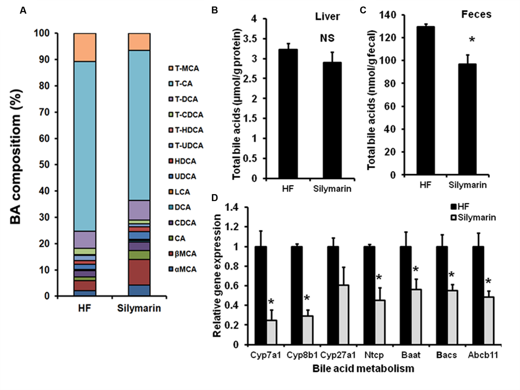 Silymarin (Legalon, Madaus, German) powder was dissolved in dimethylsulfoxide to the final concentration of 40 mg/ml for cell culture. Silybin, GW4064, T090173, Rosiglitazone, int-777, WY14643, rifampicin, TNFα, and all of the BAs standard references mentioned in this article were purchased from Sigma–Aldrich (St. Louis, MO, USA). HF diets (60% of calories derived from fat), and low-calorie diets (10% of calories derived from fat) were purchased from Research Diet (D12492, D12450B, New Brunswick, NJ, USA).