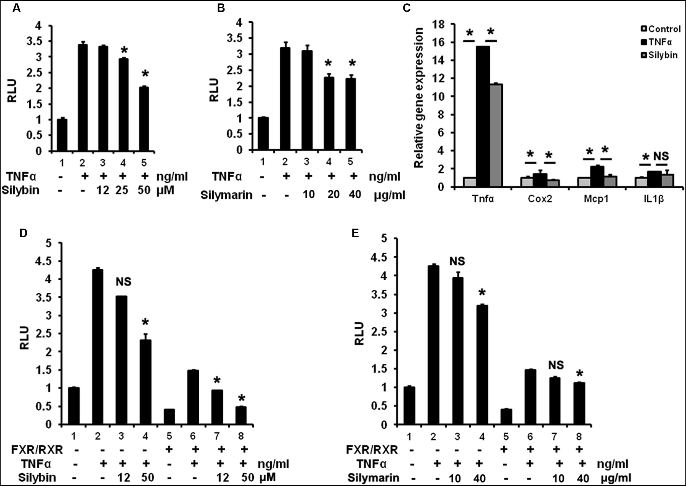 HepG2 (ATCC) cells were seeded on six-well plates (1 × 106 cells/well) and grown to 80% confluence with high-glucose DMEM containing 10% FBS at 37°C in 5% CO2. The following day, cells were treated with vehicle control, silymarin (40 μg/ml) or silybin (25 μM). After 18-h treatment, the cells were treated with or without TNFα (10 ng/mL) and then collected for RNA isolation after 6-h incubation.