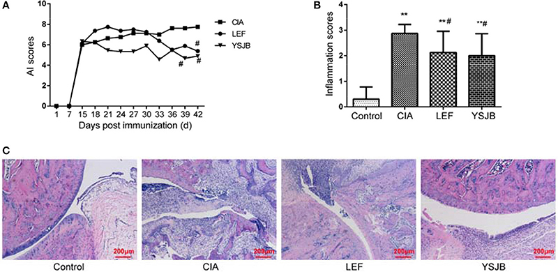 Figure 1. Effects of the YSJB on the progression of arthritis in CIA rats. Rats were orally administered with YSJB (1.29 g/kg·d), LEF (2.15 mg/kg·d), or pure water (both control group and CIA group) for 28 days on the 15th day after primary immunization. The arthritis and inflammation scores were evaluated. (A) Line plots represented the arthritis index of CIA group, LEF group and YSJB group. (B) Bar plots represented the inflammation scores of all the groups. (C) Representative pathological sections of the ankle joint by H&E staining. Data are presented as means ± SD. **P < 0.01 compared with control group. #P < 0.05 compared with CIA group.