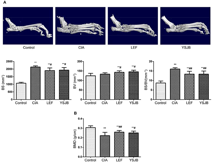Figure 2. Micro-CT and dual energy X-ray scan demonstrate the bone-protective efficiency of YSJB on ankle joints and lumbar vertebrae in CIA rats. (A) Representative three-dimensional renditions of the ankle joint and bar plots of bone surface, bone volume, bone surface-to-bone volume ratio (BS/BV). (B) Bar plots represented BMD of the lumbar vertebrae. Data are presented as means ± SD. **P < 0.01 compared with control group. #P < 0.05, ##P < 0.01 compared with CIA group.