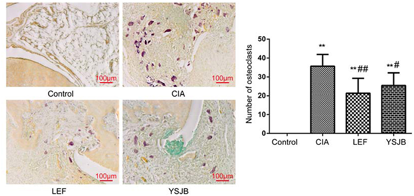 Figure 3. The YSJB inhibits osteoclast differentiation in CIA rats. The sections of ankle joints were stained with TRACP, and the number of osteoclasts was evaluated. The data are presented as means ± SD. **P < 0.01 compared with control group. #P < 0.05, ##P < 0.01 compared with CIA group.