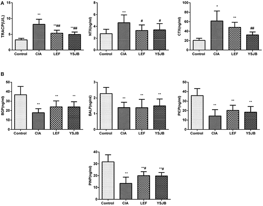 Figure 4. Regulation of bone markers after treated with YSJB in CIA rats. (A) Bar plots represented the markers of bone resorption with TRACP, NTX and CTX. (B) Bar plots represented the markers of bone formation with BGP, BALP PICP and PINP. The data are presented as means ± SD. *P < 0.05, **P < 0.01 compared with control group. #P < 0.05, ##P < 0.01 compared with CIA group.