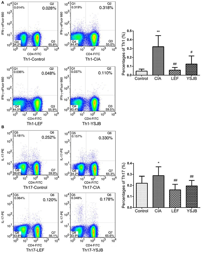 Figure 5. YSJB decreases the percentage of Th1 and Th17 cells obtained from the popliteal lymph node assessed by flow cytometry. (A) The percentage of Th1 cells are shown through staining with CD4, IFNγ. (B) The percentage of Th17 cells are shown through staining with CD4, IL-17. Data are presented as means ± SD. *P < 0.05, **P < 0.01 compared with control group. #P < 0.05, ##P < 0.01 compared with CIA group.