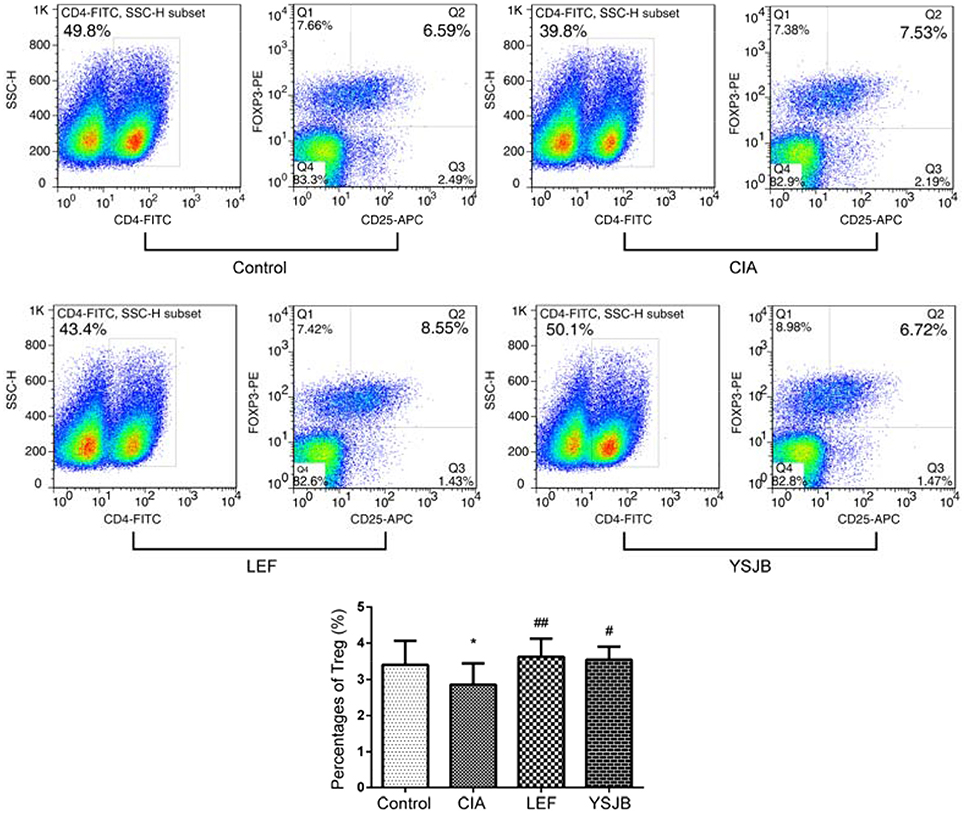 Figure 6. YSJB increases the percentage of Tregs obtained from the popliteal lymph node assessed by flow cytometry. The percentage of Tregs (CD4+CD25+FoxP3+) is shown through staining with representative antibodies against CD4, CD25, and FoxP3. The data are presented as means ± SD. *P < 0.05 compared with control group. #P < 0.05, ##P < 0.01 compared with CIA group.