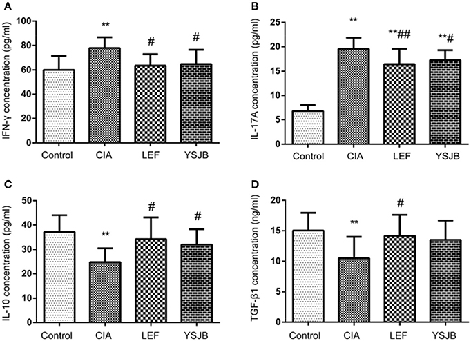 Figure 7. Regulation of cytokines treated with YSJB in CIA rats. Serum level was measured by ELISA. (A) Bar plots represented the mean levels of IFN-γ concentration of all groups. (B) Bar plots represented the mean levels of IL-17A concentration of all groups. (C) Bar plots represented the mean levels of IL-10 concentration of all groups. (D) Bar plots represented the mean levels of TGF-β1 concentration of all groups. The data are presented as means ± SD. **P < 0.01 compared with control group. #P < 0.05, ##P < 0.01 compared with CIA group.