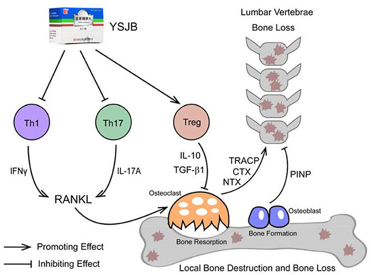 Yi Shen Juan Bi Pill (YSJB), which contains 20 medicinal materials, was developed by Professor Liangchun Zhu, a grand master of Chinese medicine science. YSJB has been extensively used for many years in local clinics of China for the treatment of rheumatoid arthritis (RA). RA is a common autoimmune disease characterized by chronic synovial inflammation and subsequent destruction of cartilage or bone. Focal bone destruction of inflamed joints is the hallmark of RA patients, resulting in functional disability and secondary osteoporosis (Koyama and Tanaka, 2016). Clinical trials suggested that YSJB ameliorated symptoms of RA patients and decreased rheumatic factor (RF), erythrocyte sedimentation rate (ESR), and C-reactive protein (CRP) (Li et al., 2008; Zhang et al., 2011). Additionally, our previous study demonstrated that YSJB had a protective effect on joint damage in collagen-induced (CIA) rats (Xiao et al., 2014). However, we know little about the role and mechanism of YSJB in regulating bone loss and bone destruction induced by arthritis.