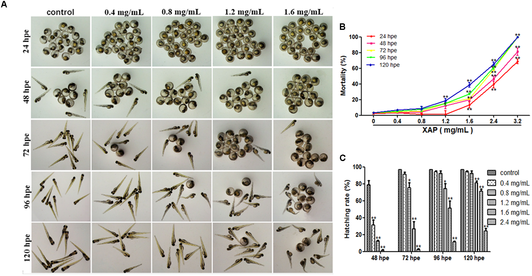 The cumulative mortality of the embryos after XAP exposure is shown in Figure 1B. Mortality was recorded at 24, 48, 72, 96, and 120 hpe in order of increasing concentration. The median lethal concentration (LC50) of XAP was calculated by sigmoidal regression using SPSS software based on the zebrafish lethality curves (Figure 1B). The LC50 was 2.66 mg/mL at 24 hpe, 2.31 mg/mL at 48 hpe, 1.92 mg/mL at 72 hpe, 1.91 mg/mL at 96 hpe, and 1.79 mg/mL at 120 hpe.
